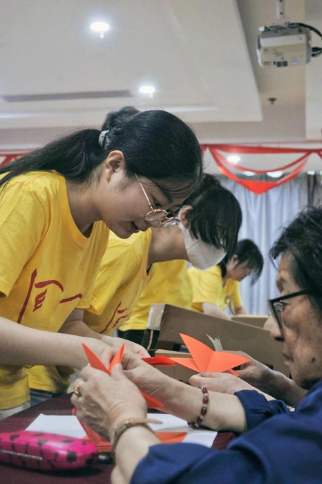 青春映晚霞,爱心暖夕阳。在歙县石潭村,服务团在当地村委会的热情协助下,认真收集农村孤寡老人生活现状及心理状况的第一手资料,与老人亲切交流。调研选题围绕乡村孤独感的难点与关注点,成员们在调研时询问耐心、态度温和,谈话体贴入微,还与老人们聊家常,深得村民的喜爱。结合所学专业,服务团成员组织开展了以阿尔兹海默症为主题的宣讲活动,带领老人们学习健脑手指操。此外,实践团还开展了折纸、唱红歌等活动,为老人们带去欢声笑语。