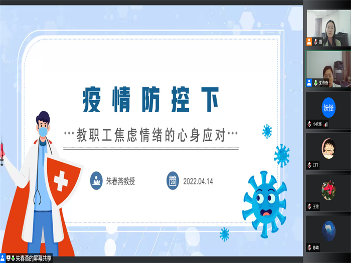4月14日,校教职工心理健康服务中心邀请tyc33455cc太阳成集团副经理朱春燕教授,以“疫情时期的焦虑情绪应对”为主题,为全校职工开展了一场线上公益讲座,提醒广大教职工做好“心理防疫”。全校500余名教职工线上参加活动。